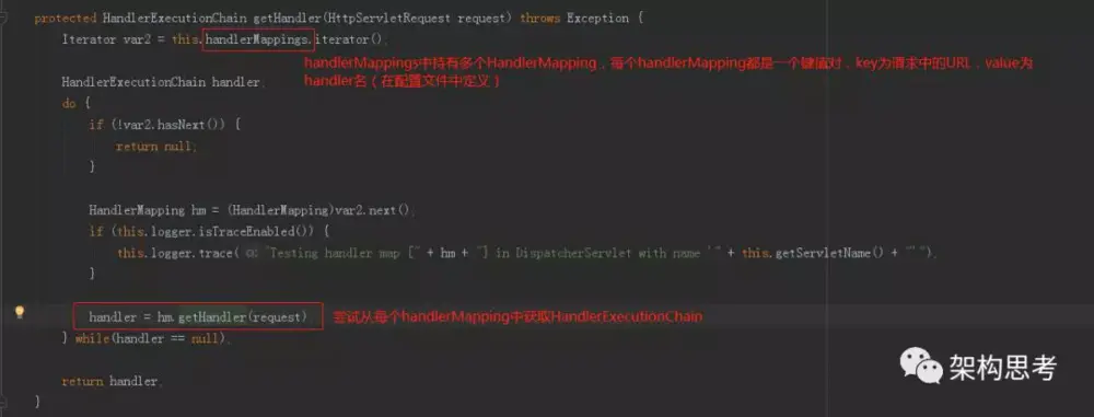 首先来看DispatcherServlet是如何从HandlerMappings中获取handler的。