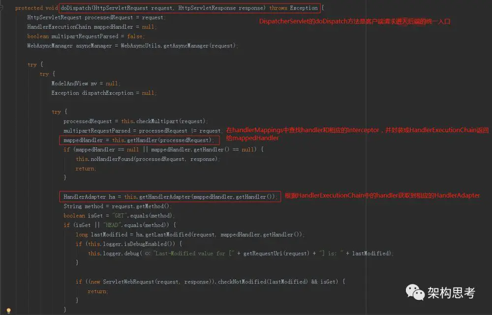 因为整个处理流程是以DispatcherServlet为核心运作的,所以首先看一下DispatcherServlet的核心方法doDispatch。图一和图二都是doDispatch方法的代码,由于一张图截不完整,所以截成两张图。