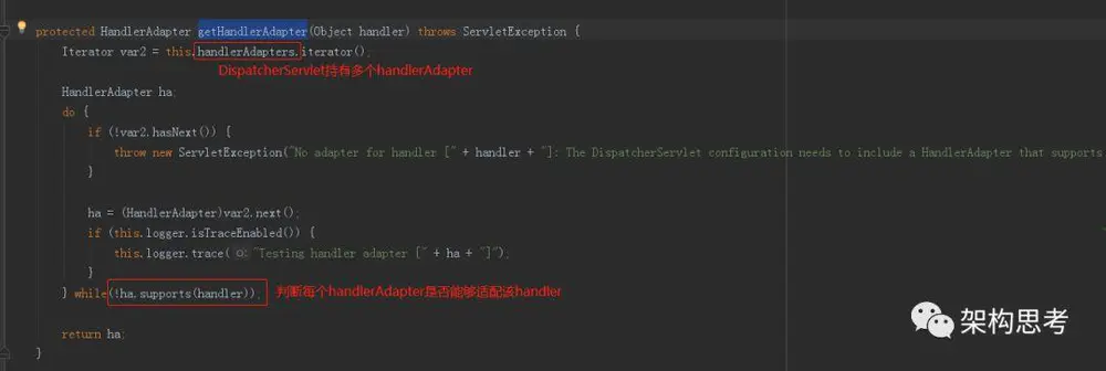 DispatcherServlet拿到HandlerExecutionChain之后,还要获取与HandlerExecutionChain中的Handler的适配器。如下图所示。