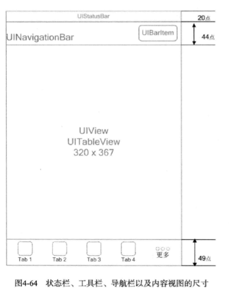 在iPhone竖屏幕中,状态栏占用20点,导航栏(或工具栏)占用44点,标签栏占用49点,实际这些尺寸在iPhone横屏幕和iPad上也保持不变。