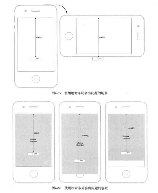 绝对布局就是视图或者控件在屏幕中的位置绝对,它的大小也是绝对的。即使它所在的父容器视图大小变化或者屏幕旋转了,它的位置也不变。相对布局在上述情况下,它的位置是变化的。使用绝对布局还是相对布局取决于应用场景。在IOS6之后,推出Autolayout布局技术。选择xib或故事板文件,打开文件检查器,可取消选中Use Autolayout复选框,然后选中改变布局的控件,打开其尺寸检查器,在View的Autosizing属性中,虚线线段代表是相对距离,实线线段代表是绝对距离,点击可相互切换。