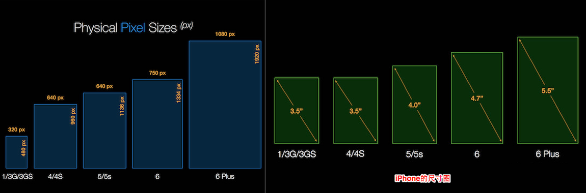 在iPhone4之前,屏幕的物理尺寸是3.5英寸,屏幕分辨率是480*320像素。iPhone4 和iPhone 4S采用视网膜屏幕技术,屏幕的物理尺寸为3.5英寸,分辨率达到了960*640像素。iPhone 5采用视网膜屏幕技术,屏幕的物理尺寸为4英寸,分辨率是1136*640