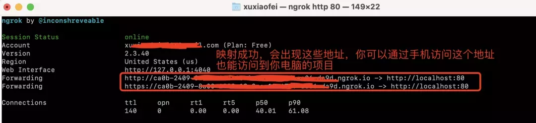 注意如上图:Forwarding后面对应的地址就是你内网穿透给你生成的映射地址,你本地电脑启动项目,可以用手机访问改地址就能访问到你电脑的项目了。