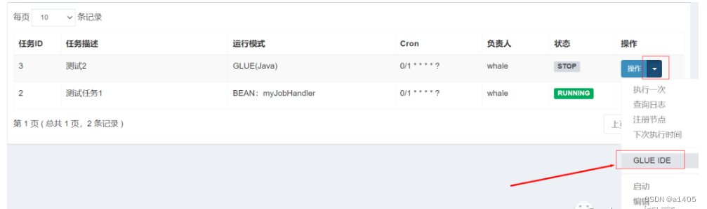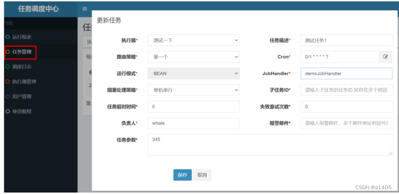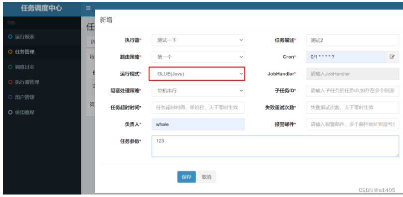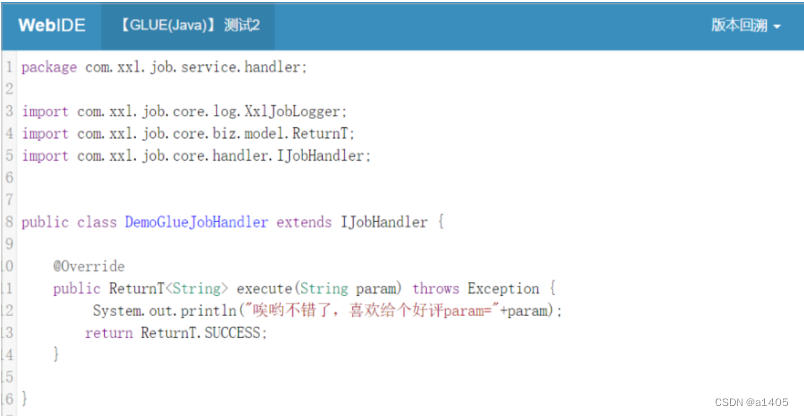 (“GLUE模式(Java)” 运行模式的任务实际上是一段继承自IJobHandler的Java类代码,它在执行器项目中运行,可使用@Resource/@Autowire注入执行器里中的其他服务),比如我的定时任务如下,编辑好之后点击保存