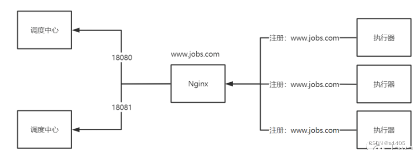 我们再hosts配置 www.jobs.com作为nginx的主机域名,然后反向代理到多个调度中心,这样一来执行器就只需要注册到www.jobs.com Nginx即可。