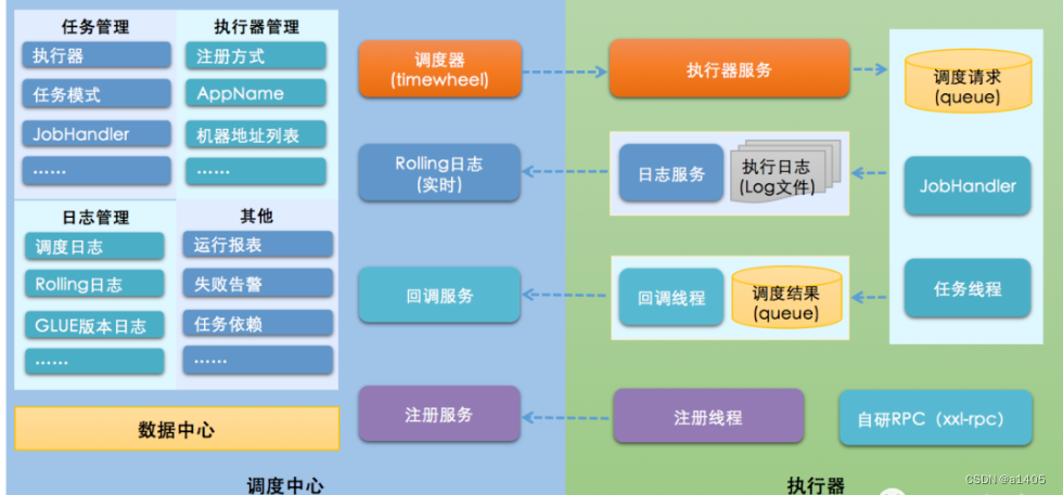 调度中心HA(中心式):调度采用中心式设计,“调度中心”基于集群Quartz实现并支持集群部署,可保证调度中心HA;执行器HA(分布式):任务分布式执行,任务"执行器"支持集群部署,可保证任务执行HA;