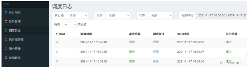 当任务”路由策略”选择”故障转移(FAILOVER)”时,当调度中心每次发起调度请求时,会按照顺序对执行器发出心跳检测请求,第一个检测为存活状态的执行器将会被选定并发送调度请求。调度成功后,可在日志监控界面查看“调度备注”