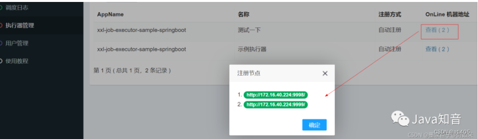 通过http://www.jobs.com/xxl-job-admin 访问调度中心管理界面,在执行器管理中可以看到多台执行器实例