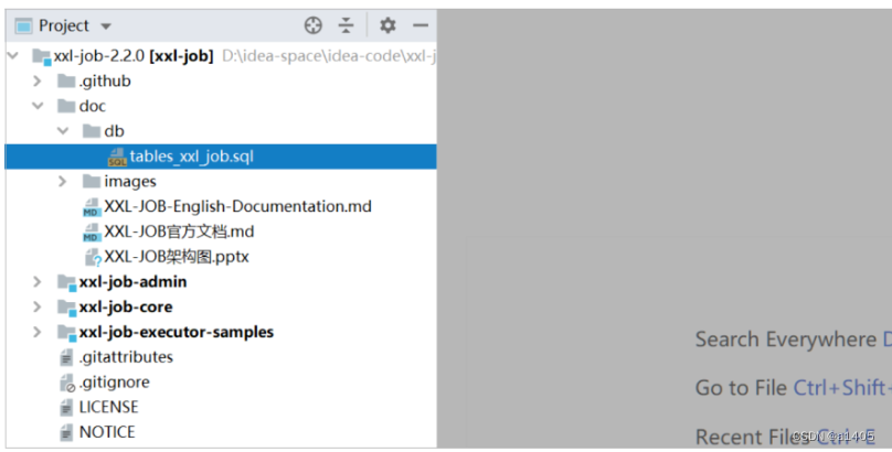 打开项目代码,获取 “调度数据库初始化SQL脚本” 并执行即可。“调度数据库初始化SQL脚本” 位置为: /xxl-job/doc/db/tables_xxl_job.sql ,数据库名:xxl_job