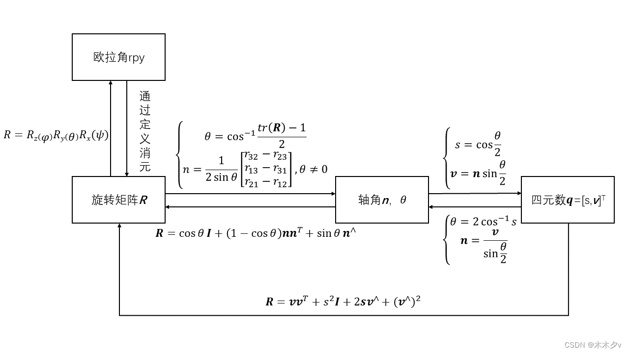 4. 画表总结旋转矩阵、轴角、欧拉角、四元数的转换关系。