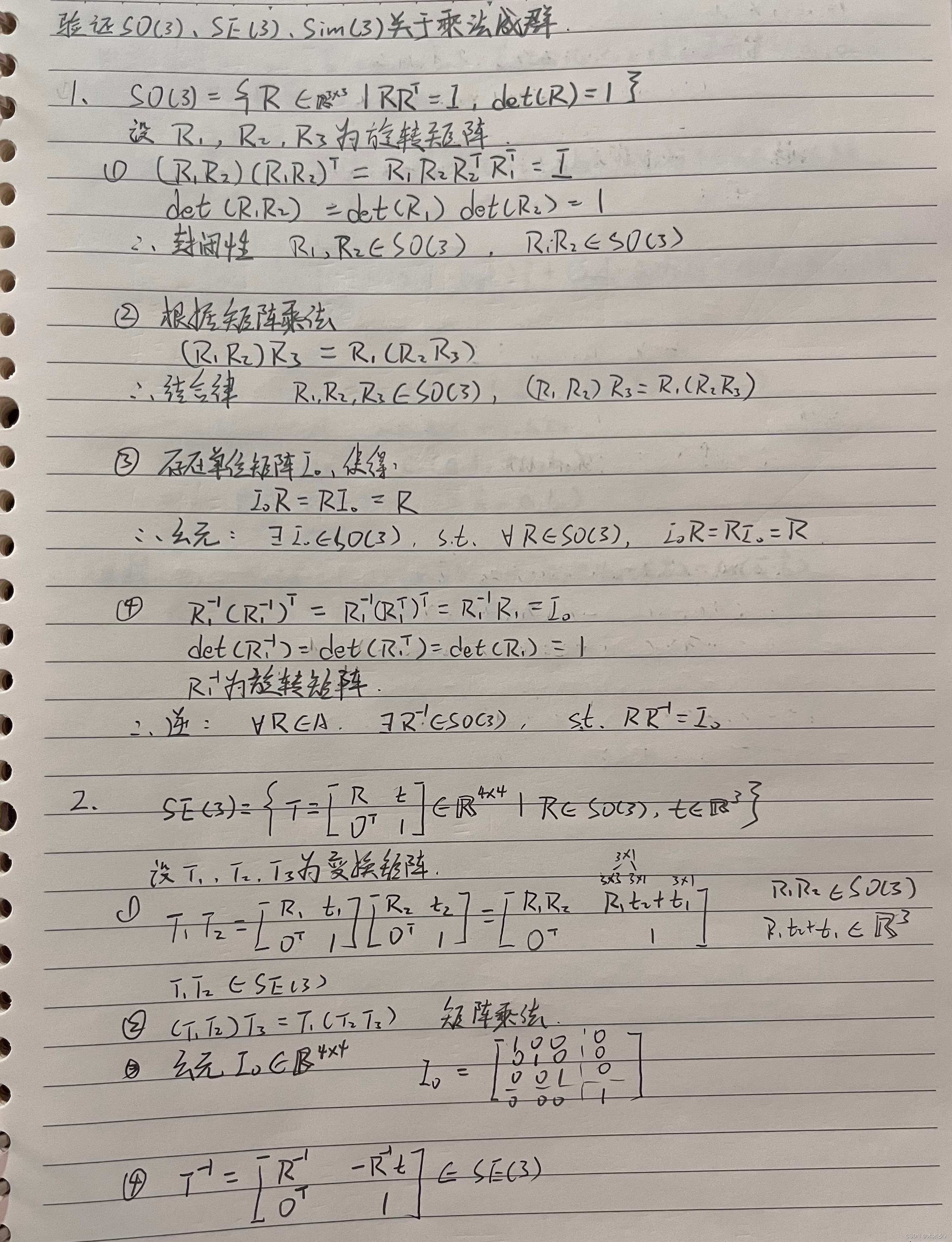 1. 验证SO(3)、SE(3)和Sim(3)关于乘法成群。