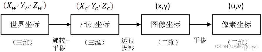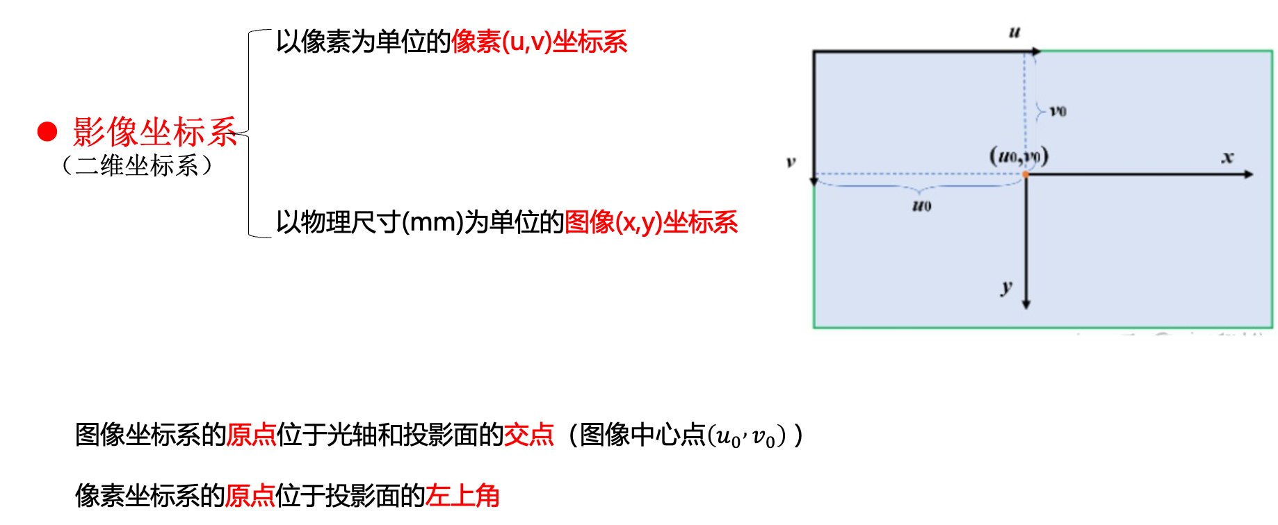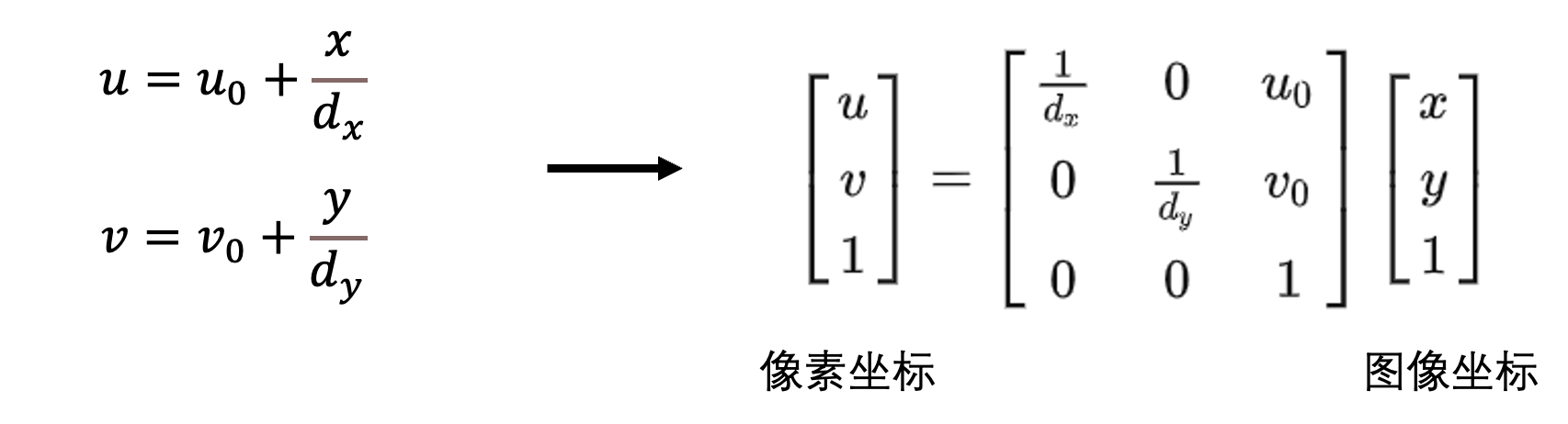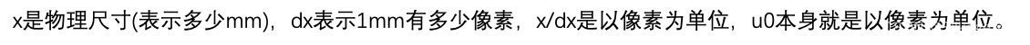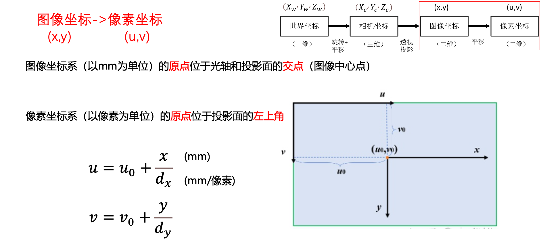 图像坐标和像素坐标都是二维坐标,并且图像坐标和像素坐标的单位不一样,故它们之间的转换只需平移即可(平移的同时要进行单位换算)。