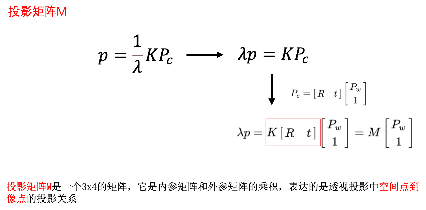 投影矩阵M是一个3x4的矩阵,它是内参矩阵和外参矩阵的乘积,表达的是透视投影中空间点到像点的投影关系。