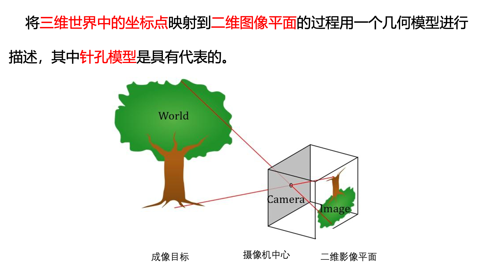 现实世界中源于某个物体的光线穿过针孔,会在底板上投影成一幅倒立的图像。真实世界的物体即为三维空间的成像目标,针孔为摄像机中心,倒影成像平面则为二维影像平面。