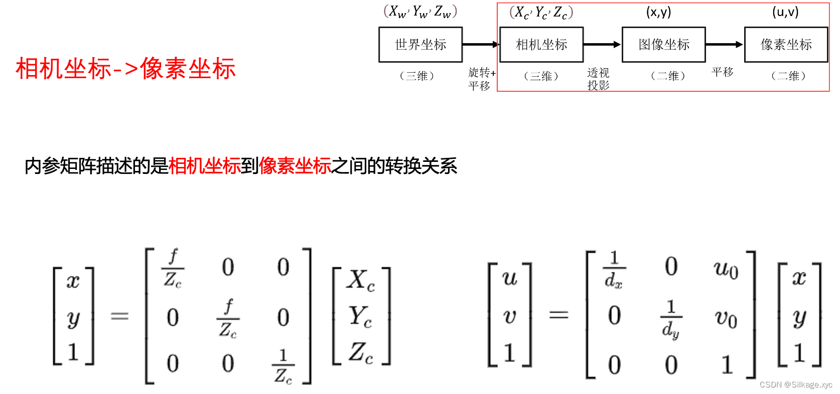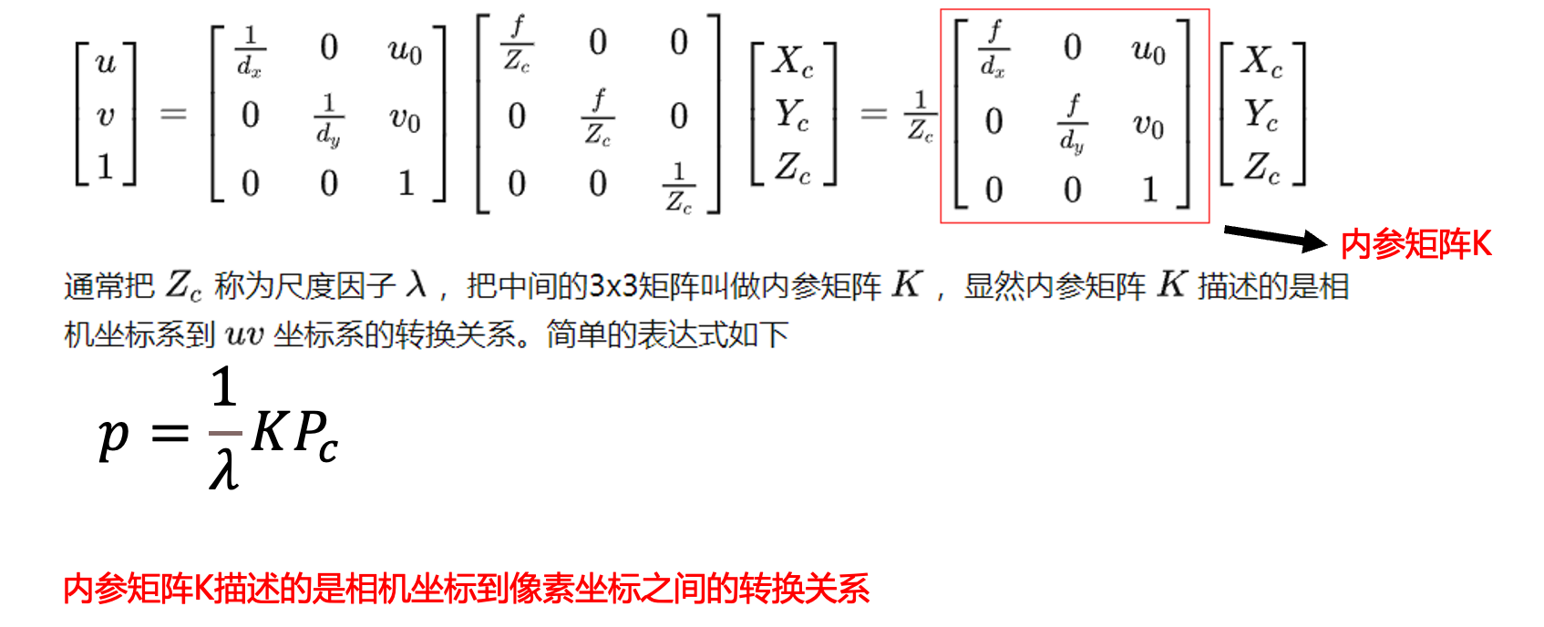 相机坐标->像素坐标时需要使用内参矩阵,内参矩阵描述的是相机坐标到像素坐标之间的转换关系。