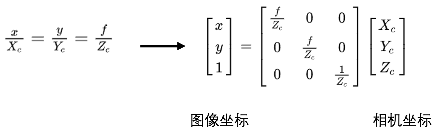 三维到二维的转换,要先将它们的坐标都化为相机坐标系下的坐标,这里图像上的坐标化为相机坐标要借助焦距f(因为图像到相机坐标系的原点的垂直距离为f),故像素p在相机坐标系下的坐标为(x,y,f),而空间点P在相机坐标系下的坐标为(X,Y,Z)。它们成比例关系。