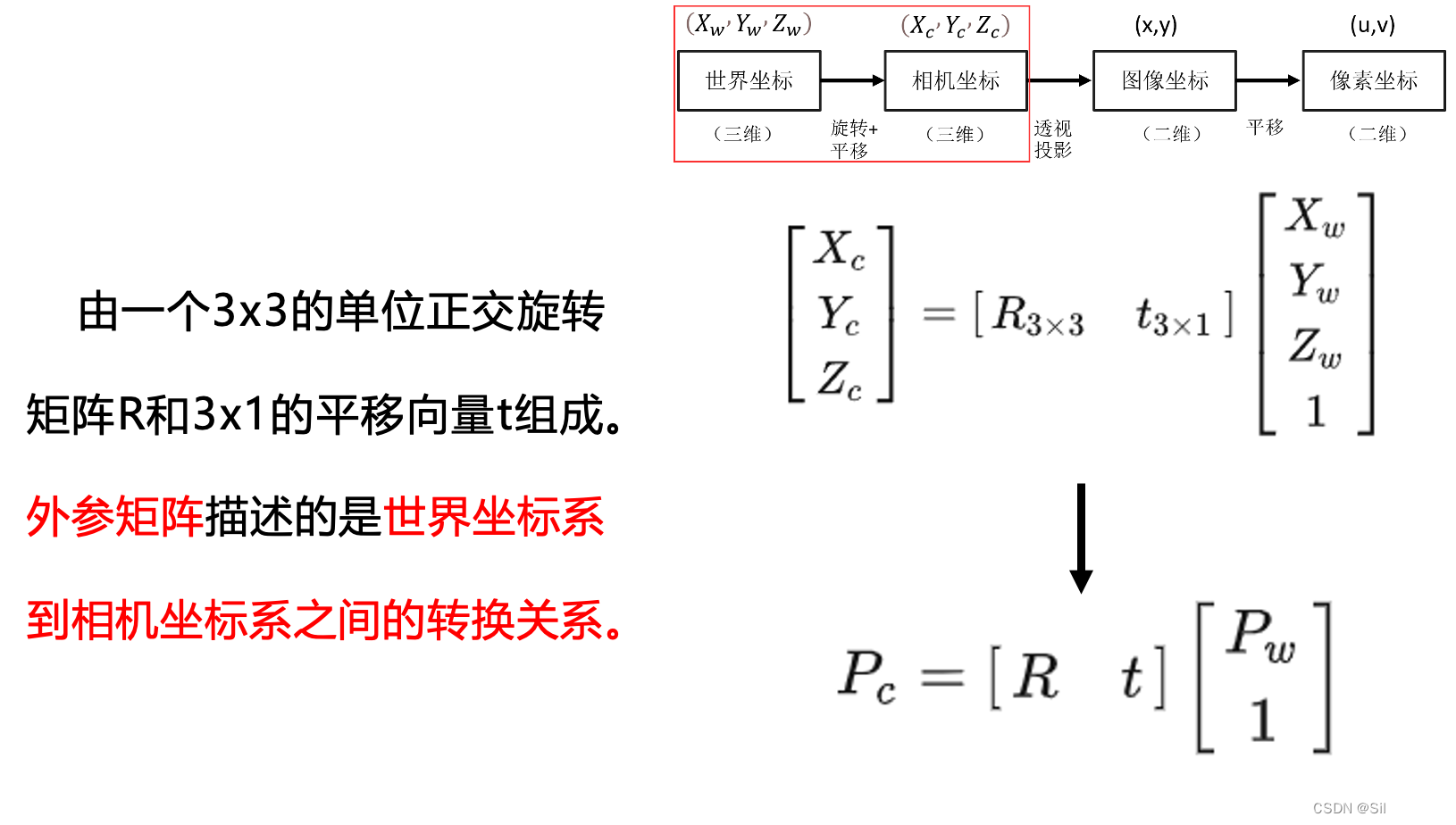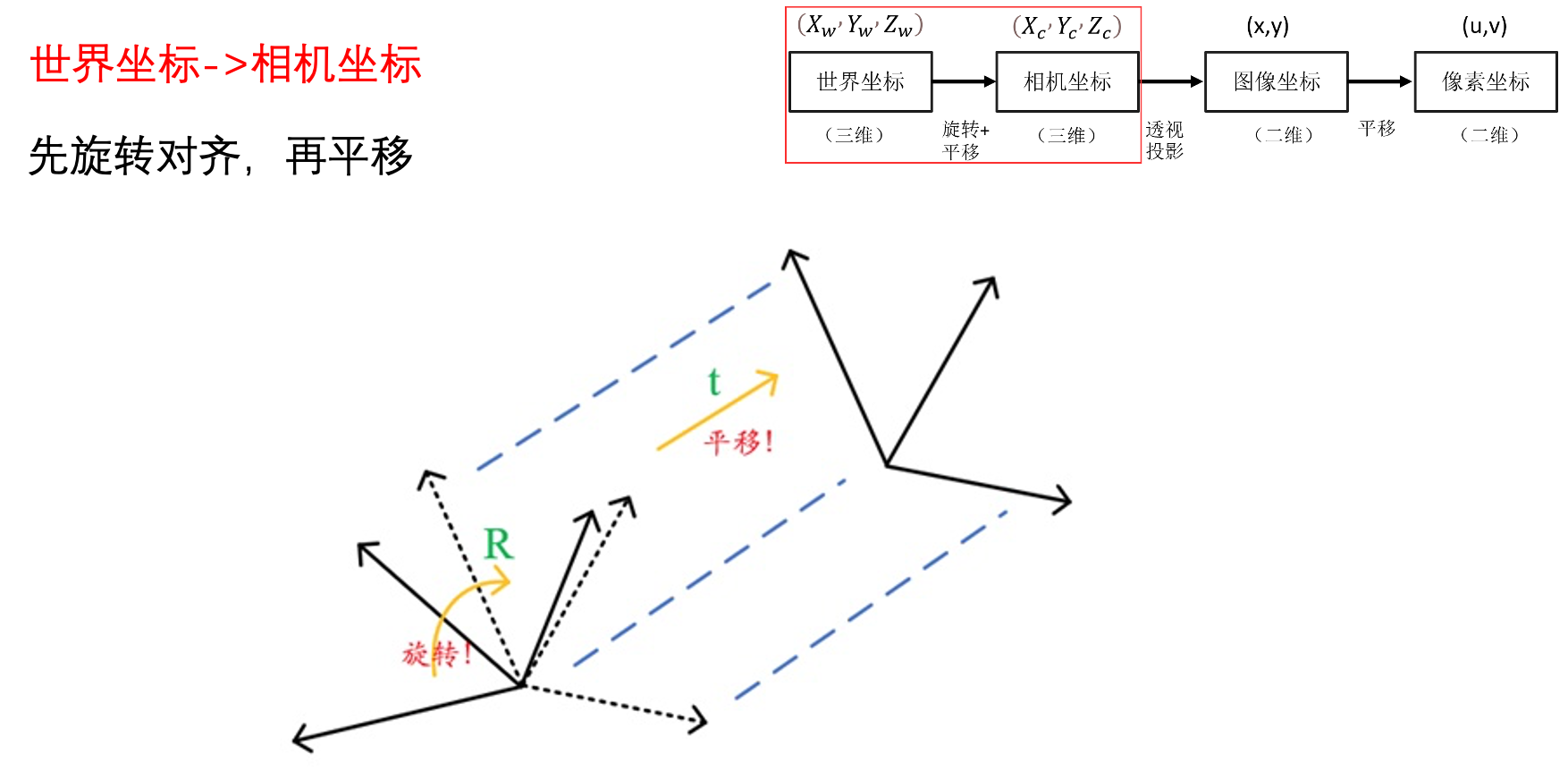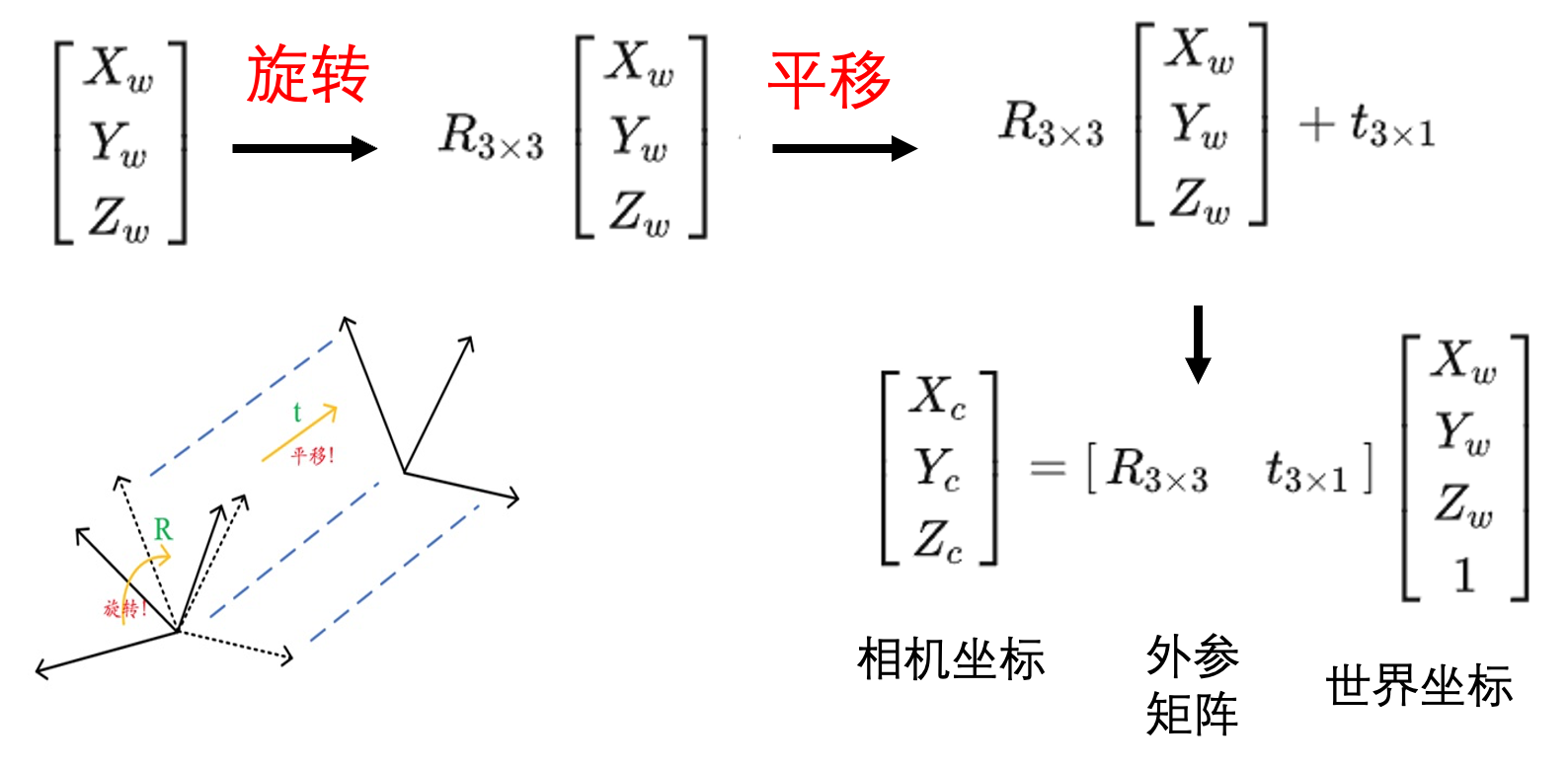 世界坐标转换成相机坐标要乘以外参矩阵得到,外参描述的是世界坐标到相机坐标之间的转换关系。