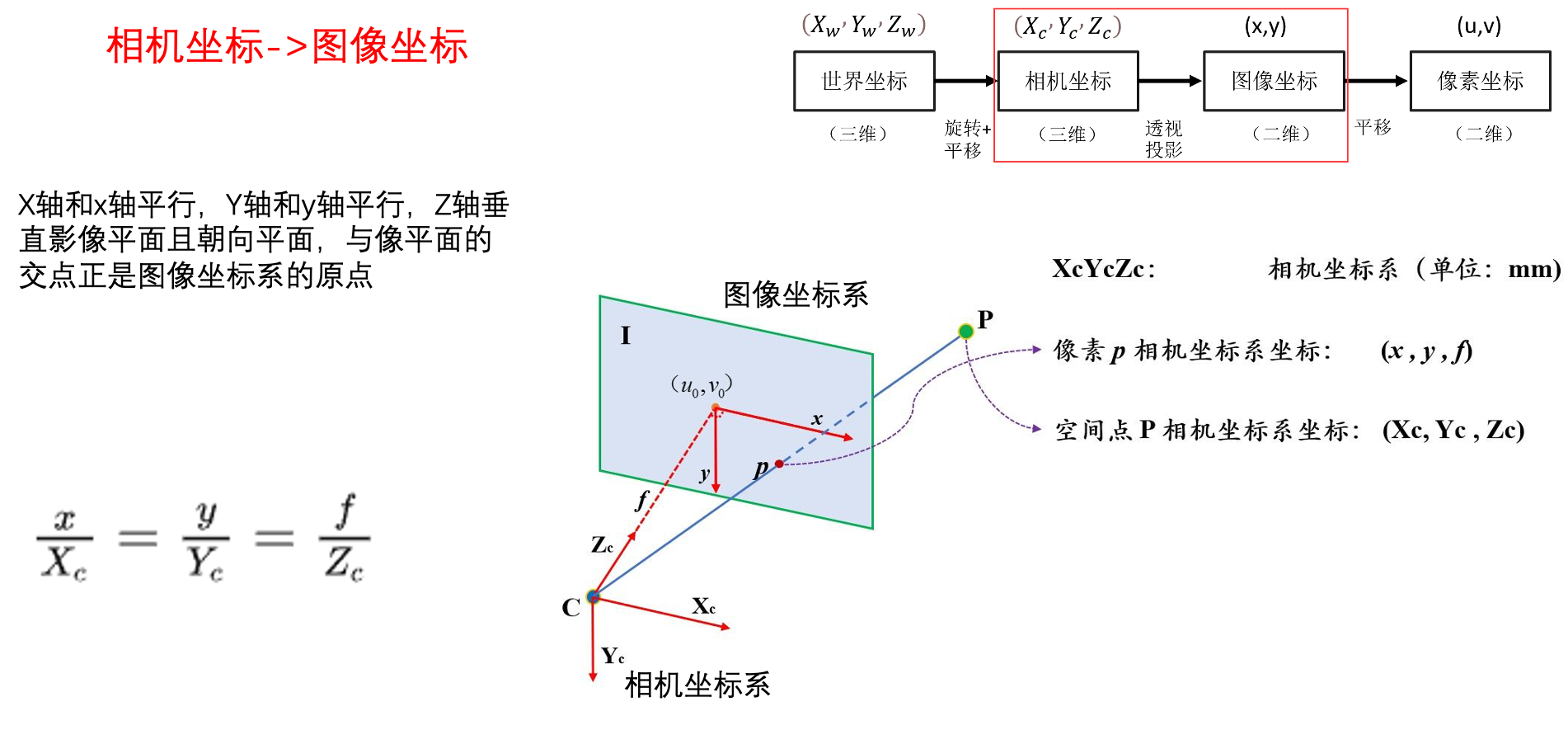 图像上任意像素点在相机坐标系下的坐标为(x,y,f),(两个坐标系原点距离为焦距f),空间点的相机坐标系坐标为(X,Y,Z),将线段CP和线段Cp投影到三个相机坐标轴,都是相似三角形,成比例的对应关系