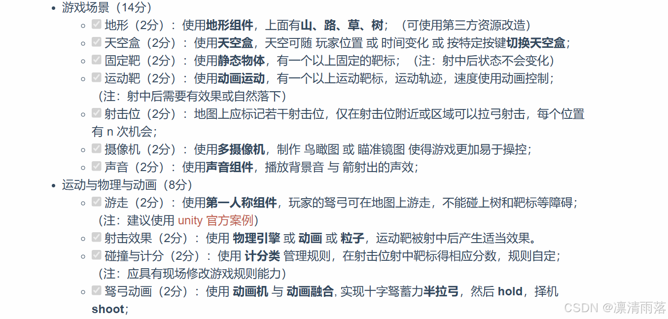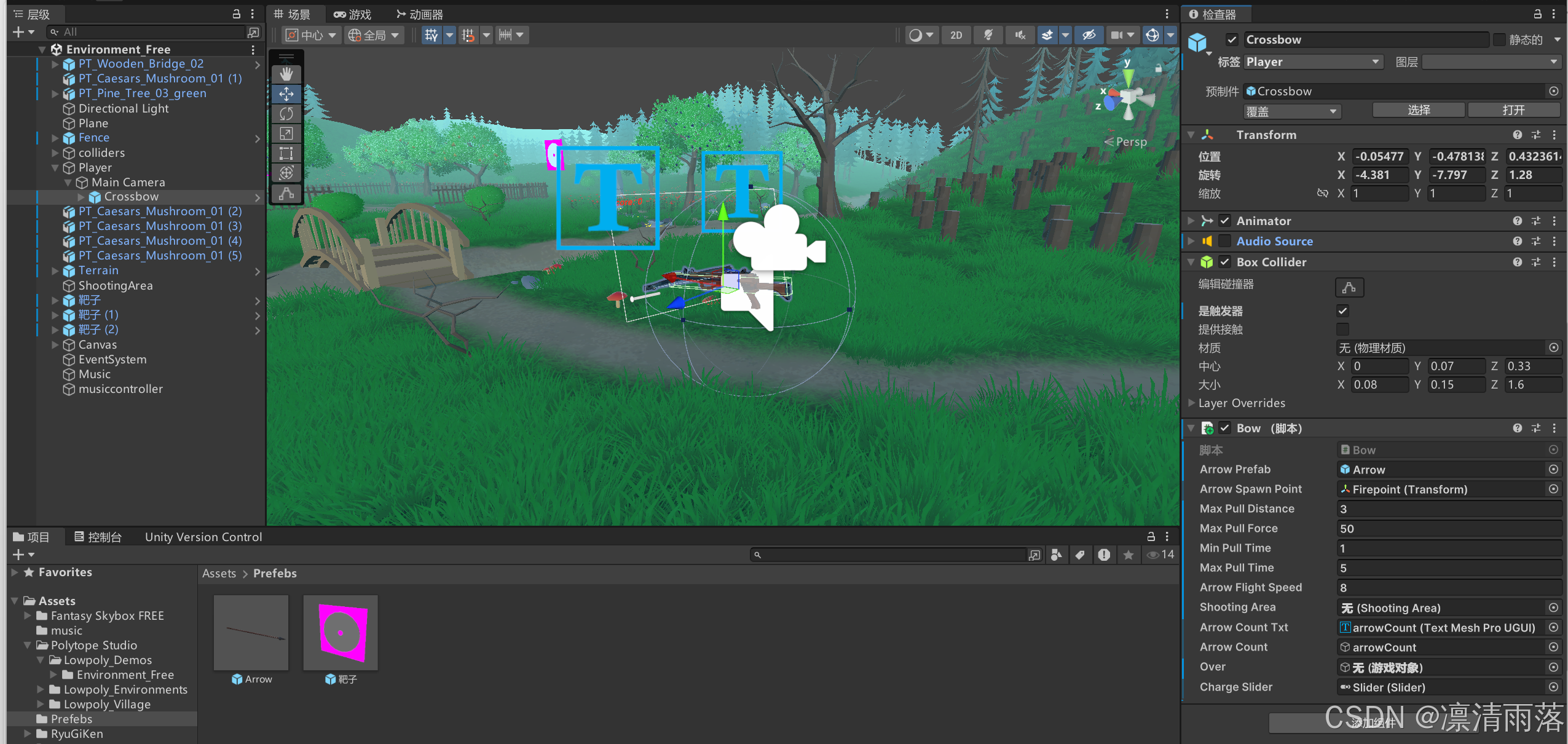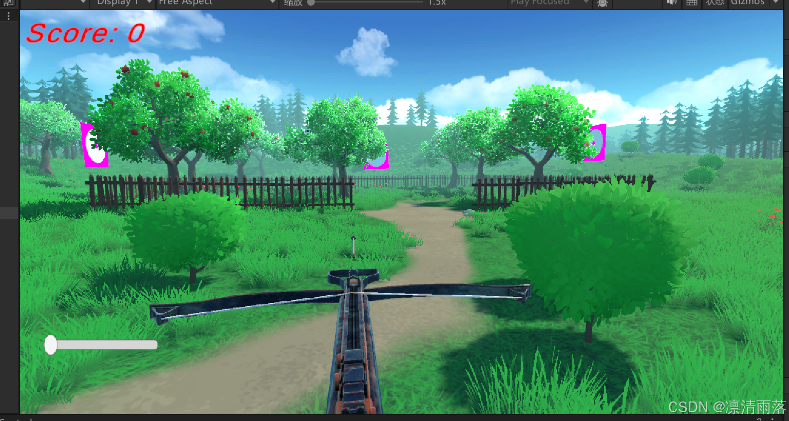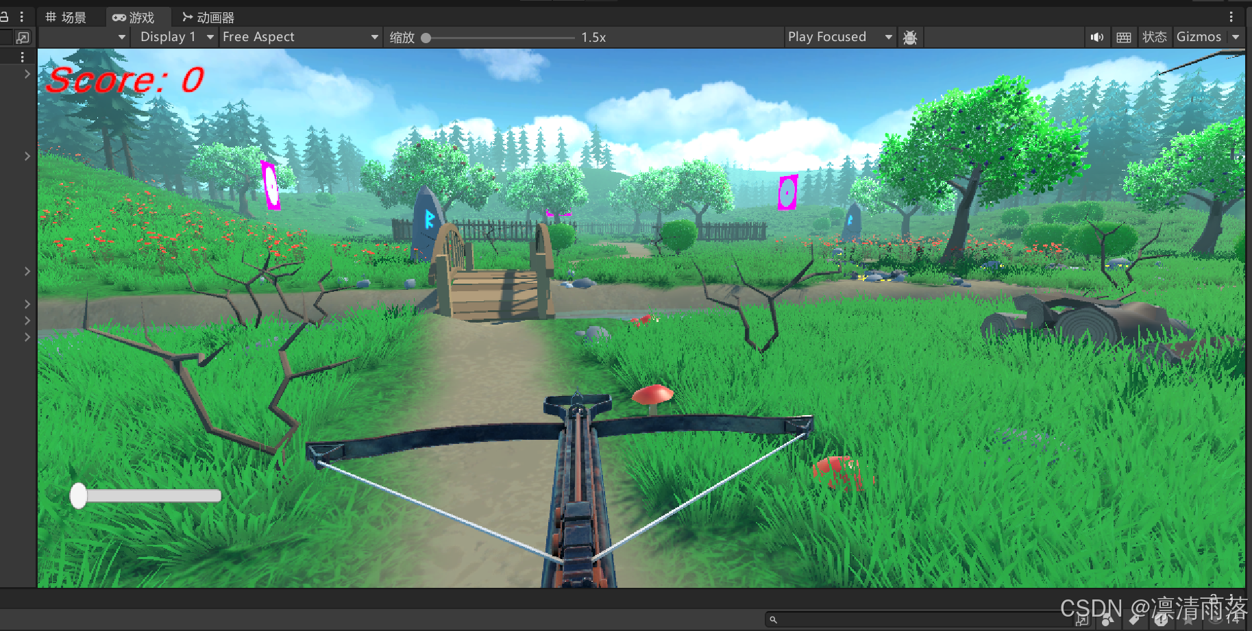 按下左键重置蓄力条,播放拉弓动画,持续蓄力更新进度条,松开鼠标射出弓箭,在弓弩前添加一个子对象作为射击点,射箭瞬间在射击点实例化一支弓箭设置速度射出