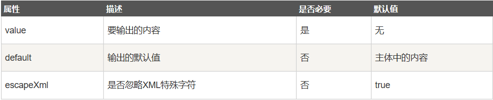 <c:out value="<string>" default="<string>" escapeXml="<true|false>"/>