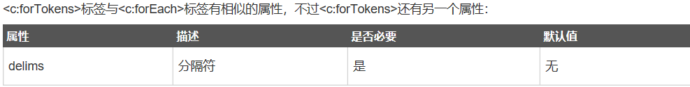 <c:forTokens>标签通过指定分隔符将字符串分隔为一个数组然后迭代它们。