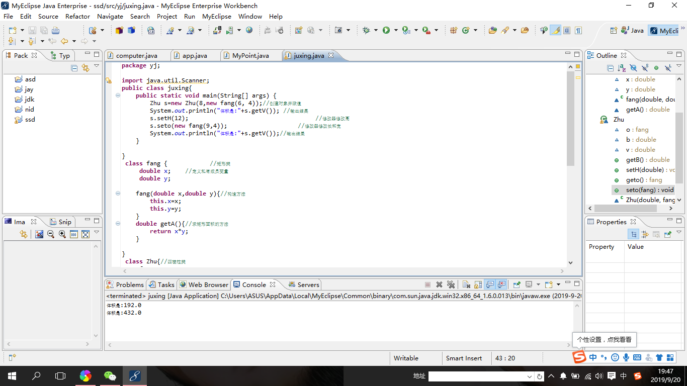 package yj;//创建一个包 import java.util.Scanner;//进行导入 public class juxing{ //定义一个类名 public static void main(String[] args) { Zhu s=new Zhu(8,new fang(6, 4));//创建对象并赋值 System.out.println("体积是:"+s.getV()); //输出结果 s.setH(12); //给高进行赋值 s.seto(new fang(9,4)); //给长和宽赋值 System.out.println("体积是:"+s.getV());//输出结果 } } class fang { //定义一个矩形类 double x; //定义成员变量x double y;// 定义成员变量y fang(double x,double y){//构造方法 this.x=x; this.y=y; } double getA(){//求矩形面积的方法 return x*y; } } class Zhu{//四棱柱类 fang o; double b; double v; public double getB() { //成员变量的修改器和访问器 return b; } public void setH(double b) { this.b = b; } public fang geto() { return o; } public void seto(fang o) { this.o = o; } Zhu(double b,fang o){ //构造方法 this.b=b; this.o=o; } double getV(){//求体积的方法 return o.getA()*b; } }