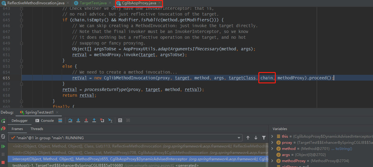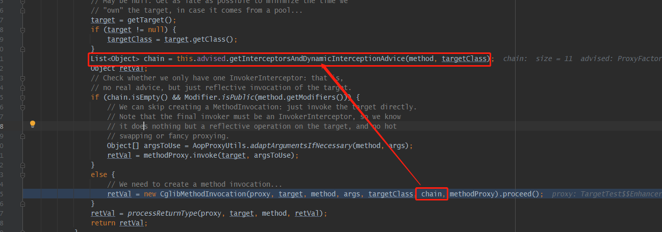 通过CglibAopProxy的DynamicAdvisedInterceptor的intercept方法new CglibMethodInvocation(proxy, target, method, args, targetClass, chain, methodProxy)CglibMethodInvocation继承自ReflectiveMethodInvocation,传入的chain作为连接器链