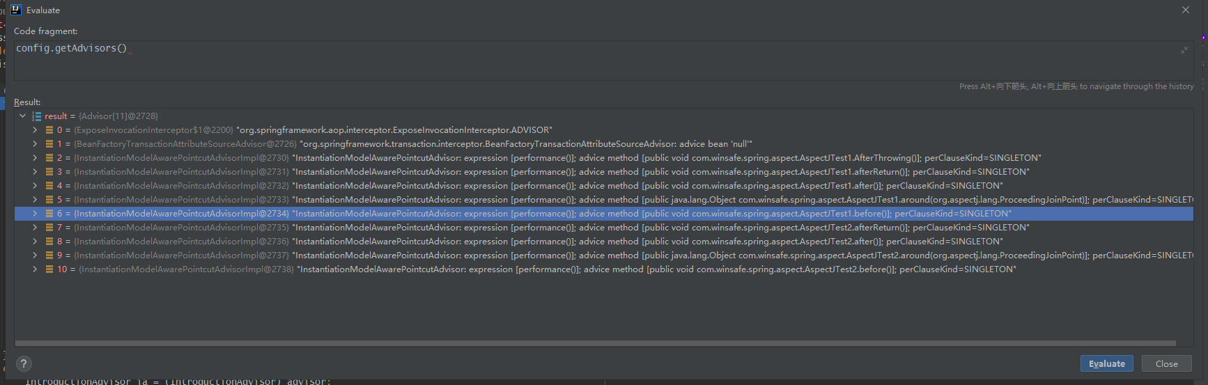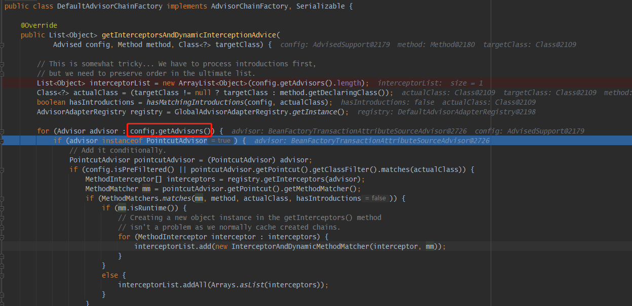发现config.getAdvisors()中的拦截器顺序和属性interceptorsAndDynamicMethodMatchers顺序一致