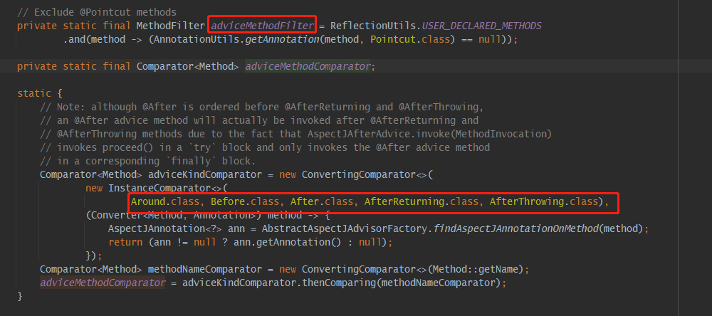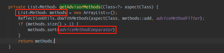 查看advisors是如何拿到的,其顺序又是什么? BeanFactoryAspectJAdvisorsBuilder#buildAspectJAdvisors->ReflectiveAspectJAdvisorFactory#getAdvisors->ReflectiveAspectJAdvisorFactory#getAdvisorMethods,通过Class反射获取类的所有方法并进行adviceMethodFilter和adviceMehtodComparator排序(排序规则为@Around, @Before, @After, @AfterReturning, @AfterThrowing)