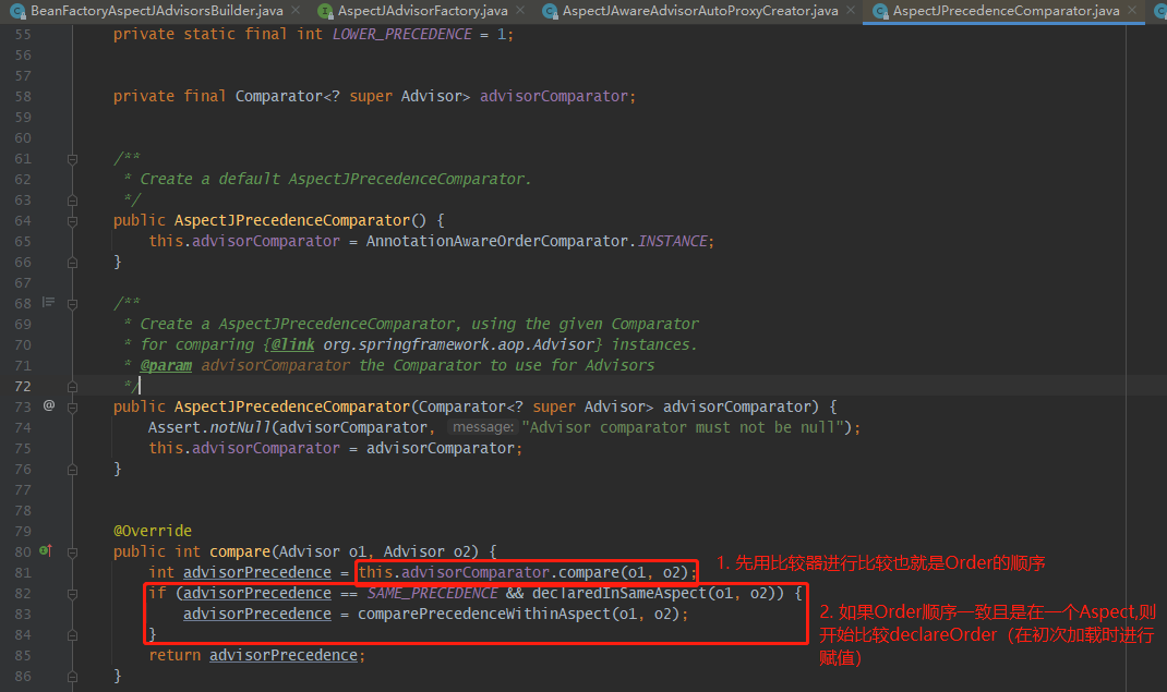 // AspectJPrecedenceComparator类 compare 分析 @Override public int compare(Advisor o1, Advisor o2) { int advisorPrecedence = this.advisorComparator.compare(o1, o2); // 先用使用Order排序器进行排序,值越小,优先级越高 if (advisorPrecedence == SAME_PRECEDENCE && declaredInSameAspect(o1, o2)) { // Order顺序值相同,且Advisor在同一个Aspect advisorPrecedence = comparePrecedenceWithinAspect(o1, o2); // 使用declarationOrder的值进行排序(详细分析见下), 这里涉及到关于declarationOrder的来源见下分析 } return advisorPrecedence; } // spirng5.xdeclarationOrder的来源分析: 在步骤6中可以看到advisor的来源(ReflectiveAspectJAdvisorFactory#getAdvisors) @Override public List<Advisor> getAdvisors(MetadataAwareAspectInstanceFactory aspectInstanceFactory) { // // sprng 5.2.7之前 List<Advisor> advisors = new LinkedList<Advisor>(); for (Method method : getAdvisorMethods(aspectClass)) { // 重点1:获取所有的advisorMethods通过class 按照 @Around, @Before, @After, @AfterReturning, @AfterThrowing优先排序,注解相同则按照方法名按照自然排序 Advisor advisor = getAdvisor(method, lazySingletonAspectInstanceFactory, advisors.size(), aspectName); // 重点2: advisors.size()就是Advisor的declarationOrder值 if (advisor != null) { advisors.add(advisor); } } // 3.分析同一个Aspect获取的Method按照 @Around, @Before, @After, @AfterReturning, @AfterThrowing 排序,它们的declarationOrder值依次递增分别是0,1,2,3,4 // ... // sprng 5.2.7 for (Method method : getAdvisorMethods(aspectClass)) { // Prior to Spring Framework 5.2.7, advisors.size() was supplied as the declarationOrderInAspect to getAdvisor(...) to represent the "current position" in the declared methods list. However, since Java 7 the "current position" is not valid since the JDK no longer returns declared methods in the order in which they are declared in the source code. Thus, we now hard code the declarationOrderInAspect to 0 for all advice methods discovered via reflection in order to support reliable advice ordering across JVM launches. Specifically, a value of 0 aligns with the default value used in AspectJPrecedenceComparator.getAspectDeclarationOrder(Advisor). Advisor advisor = getAdvisor(method, lazySingletonAspectInstanceFactory, 0, aspectName); if (advisor != null) { advisors.add(advisor); } } } /** AspectJPrecedenceComparator类 comparePrecedenceWithinAspect 分析 由上述declarationOrder的来源分析 @Around, @Before, @After, @AfterReturning, @AfterThrowing它们的declarationOrder值依次递增分别是0,1,2,3,4 如果有一个是afterAdvice即 afte, afterreturn,afterthrowing 则排序时值越低,优先级越低, 说明排序时afterAdvice大于非afterAdvice(Around,Before) 即所有的 afterAdvice(afterthrowing > afterreturn > after) > 非afterAdvice(Around,Before) 否则 值越低优先级越高,Around > Before 结合上述得出Afterthrowing > Afterreturn > After > Around > Before (afterAdvice优先级最高且afterAdvice是值越低优先级越高,反之非afterAdvice值越低优先级越高) */ private int comparePrecedenceWithinAspect(Advisor advisor1, Advisor advisor2) { boolean oneOrOtherIsAfterAdvice = (AspectJAopUtils.isAfterAdvice(advisor1) || AspectJAopUtils.isAfterAdvice(advisor2)); int adviceDeclarationOrderDelta = getAspectDeclarationOrder(advisor1) - getAspectDeclarationOrder(advisor2); if (oneOrOtherIsAfterAdvice) { // the advice declared last has higher precedence if (adviceDeclarationOrderDelta < 0) { // advice1 was declared before advice2 // so advice1 has lower precedence return LOWER_PRECEDENCE; } else if (adviceDeclarationOrderDelta == 0) { return SAME_PRECEDENCE; } else { return HIGHER_PRECEDENCE; } } else { // the advice declared first has higher precedence if (adviceDeclarationOrderDelta < 0) { // advice1 was declared before advice2 // so advice1 has higher precedence return HIGHER_PRECEDENCE; } else if (adviceDeclarationOrderDelta == 0) { return SAME_PRECEDENCE; } else { return LOWER_PRECEDENCE; } } }