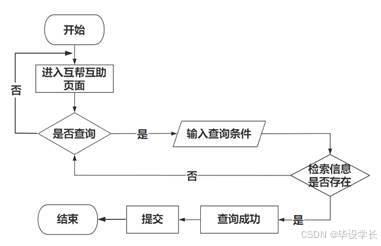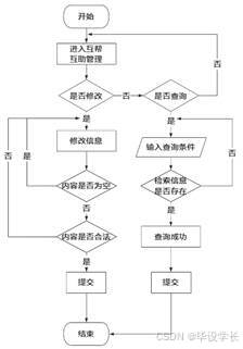 互帮互助模块提供查询、查看和分类查看功能,帮助用户快速找到所需的帮助信息。用户可以通过查询功能查看所有发布的互帮信息,或通过查看功能浏览具体内容。分类查看则允许用户根据不同类型筛选帮助信息,便于快速定位所需的帮助。互帮互助管理页面如图5-23所示。互帮互助流程图如图5-24所示。