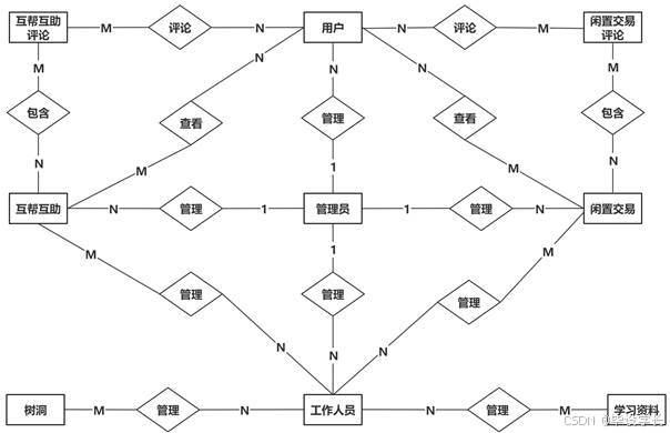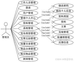 管理员系统功能主要包括:用户管理、员工管理、发布类型管理、物品分类管理、互帮互助管理、闲置交易管理、购买物品管理、资料管理、树洞管理、系统管理。管理员用例图如图3-1所示。