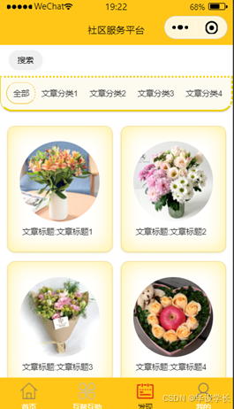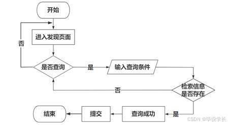 发现模块支持查询、查看和分类查看功能,帮助用户轻松发现最新的社区动态或重要信息。用户可以通过查询功能查看所有发现内容,或者通过查看功能浏览具体信息。分类查看功能帮助用户根据不同的分类筛选信息,快速找到感兴趣的内容。发现页面图如图5-25所示。发现流程图如图5-26所示。