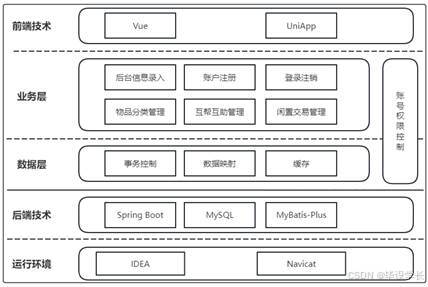 业务层主要涉及后台信息录入、账户注册、登录注销、物品分类管理、互帮互助管理、闲置交易管理等功能模块,确保了系统操作的全面性与用户的互动体验。数据层则涉及事务控制、数据映射机制,保障了数据的安全性、一致性和系统的响应速度。