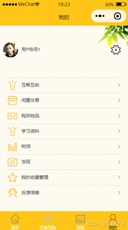 我的模块包含多个功能,用户可以根据需求选择不同的模块。包括闲置交易、购买物品、学习资料、树洞、发现、我的收藏管理和反馈信息。用户可以通过点击相应按钮,查看或管理相关内容。我的模块页面图如图5-27所示。
