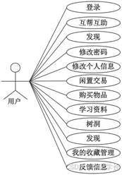 用户系统功能主要包括:互帮互助、发现、闲置交易、购买物品、学习资料、树洞、发现、我的收藏管理、反馈信息。用户用例图如图3-2所示。