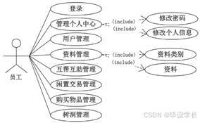 员工系统功能主要包括:用户管理、互帮互助管理、闲置交易管理、购买物品管理、资料管理、树洞管理。员工用例图如图3-2所示。