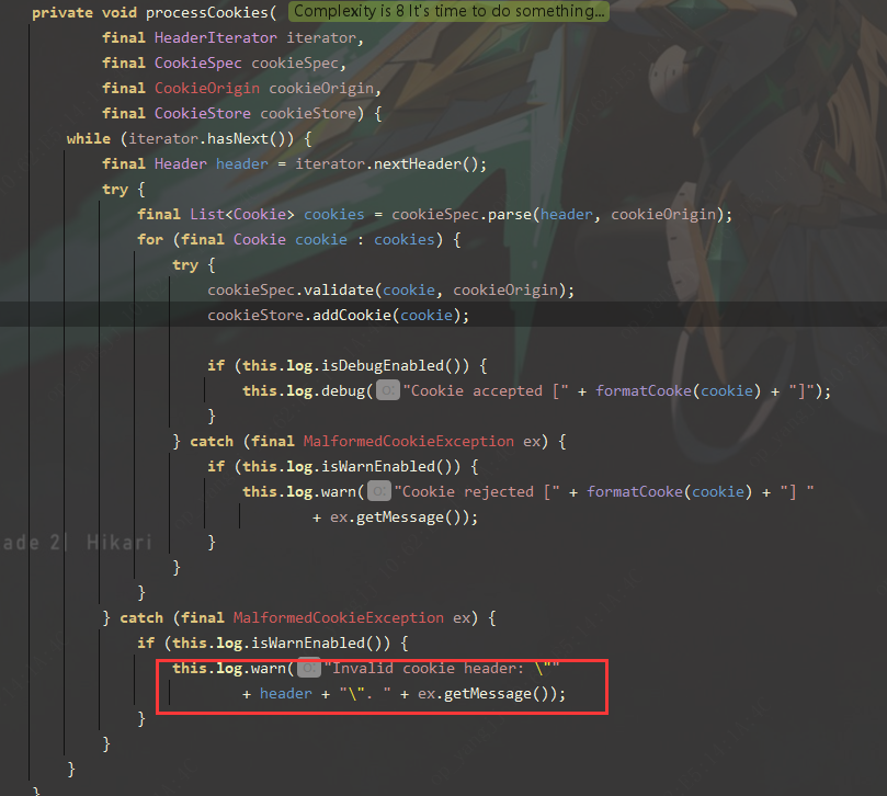 通过报错的类`ResponseProcessCookies`,直接打开源码找到打印报错日志的地方