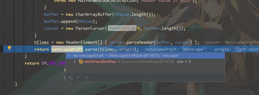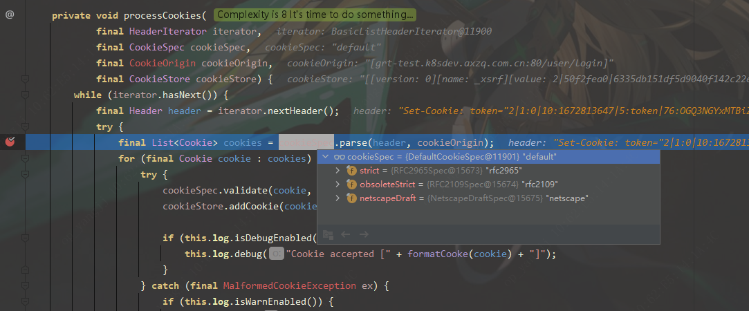 从以上图片可以看出,发生错误的地方应该时在try里面,既然日志提示了是cookie构造失败,那么很明显应该就是cookieSpec.parse方法去构建cookie报错的