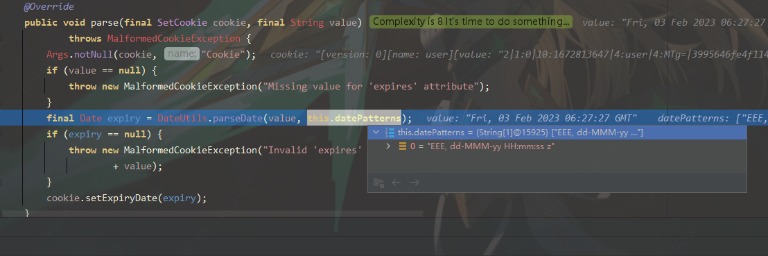 到这里很明显了,是关于cookie到期时间的格式有问题,请求中的格式`Fri, 03 Feb 2023 06:02:40 GMT` 即 EEE, dd MMM yy HH:mm:ss z,httpClient中解析的格式为`EEE, dd-MMM-yy HH:mm:ss z`,因请求中cookie到期时间的格式与解析的不符合导致的