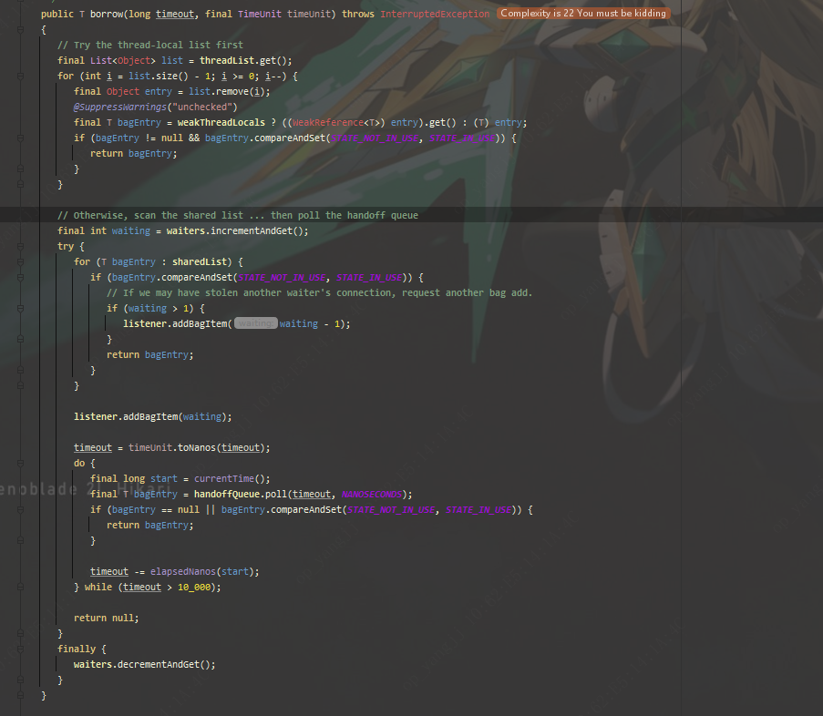 从这里可以看到,所谓的拿连接,其实是HikariCP里每个连接都有个标志位,当标志位为`STATE_NOT_IN_USE`未使用时,修改标志位为`STATE_IN_USE`使用中,修改成功时返回连接。