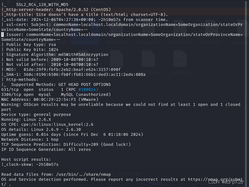 nmap -sT -v -sC -O -Pn -sV -p22,80,111,443,631,3306 192.168.213.133 -oA nmapscans/detail