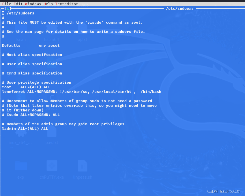 按F3打开 /etc/sudoers文件,更改loneferret的权限,在后面添加 /bin/bash