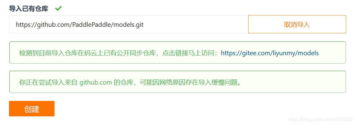点击“新建仓库”,新建页面最下端会出现“导入已有仓库”,粘贴上GitHub的地址,一下就能导入成功,完美~