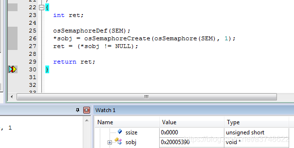 在这里申请了一个二值信号量,且信号量句柄返回给了fs->sobj。观察此地址,发现并不是:0x20000000!!!