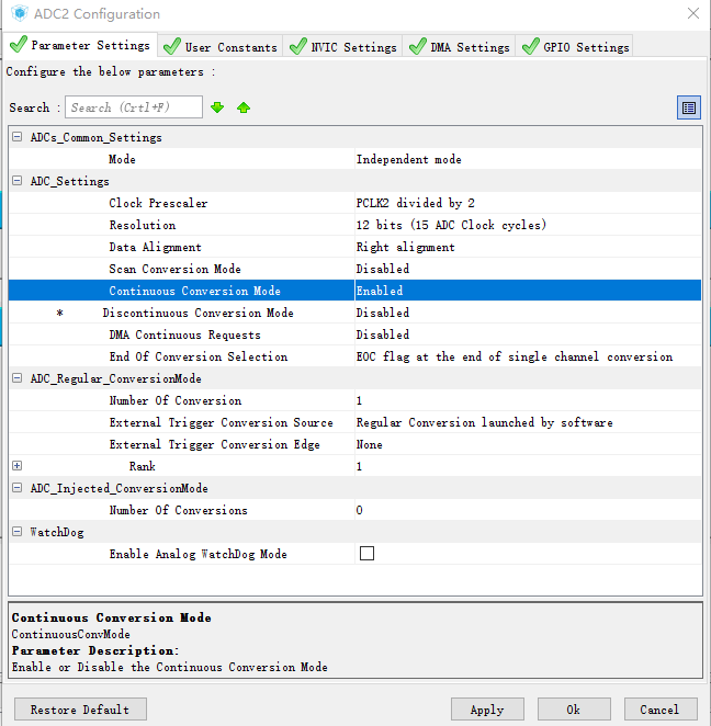 就会造成中断溢出。所以将ADC转换速率降低,或者关闭”ADC_IT_OVR“程序可以正常运行。