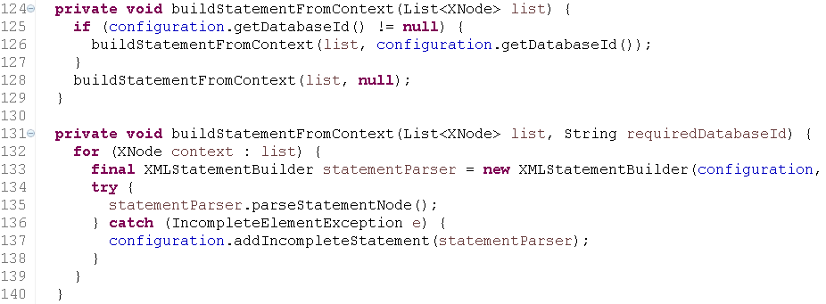 public class CRUDStatementHandler extends StatementHandlerSupport{ @Override public void handleStatementNode(Configuration configuration, SchemaSqlMapperParserDelegate delegate, XNode node) { String databaseId = configuration.getDatabaseId(); if(databaseId != null){ buildStatementFromContext(configuration, delegate, node, databaseId); } buildStatementFromContext(configuration, delegate, node, null); } private void buildStatementFromContext(Configuration configuration, SchemaSqlMapperParserDelegate delegate, XNode node, String requiredDatabaseId) { XMLStatementBuilder statementParser = SqlSessionComponetFactorys.newXMLStatementBuilder(configuration, delegate.getBuilderAssistant(), node, requiredDatabaseId); try { statementParser.parseStatementNode(); } catch (IncompleteElementException e) { configuration.addIncompleteStatement(statementParser); } } }